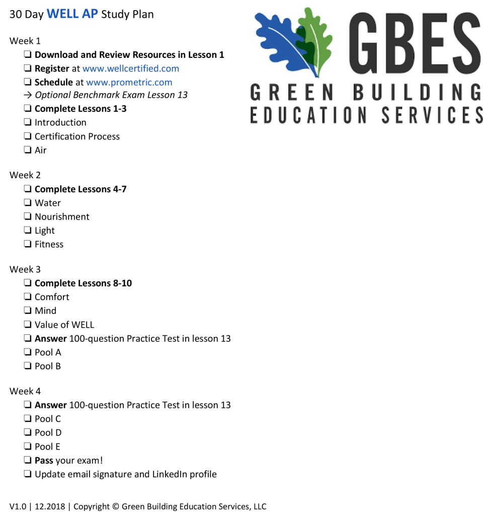 To help me prepare for this exam, I’m using the WELL AP Platinum Pack from GBES. I’ve known GBES CEO Charlie Cichetti for several years and know that they have a really good track record of success, including internationally. Back in 2009 when I was studying for the LEED AP exam, having access to multiple versions of the practice exam was a key for me. When I look back on it, I just don’t think I would have been able to understand why I was missing some questions otherwise. To study for WELL, I knew I wanted to have the same kind of tools available. From the 30 Day Study Plan seen below, you’ll see one of the first steps is the optional Benchmark Exam. As I expected, the 85 question exam kicked my butt pretty good, but I was very pleased to establish a baseline. The exam itself was extremely illuminating to get some insight into the subject matter, questions, topics addressed, etc. To the credit of GBES, the post-exam breakdown was even more insightful as to what WELL Feature categories I need to focus on throughout the rest of this journey (spoiler alert: all of them need some help). Unfortunately, I did not get a screenshot, but I’m going to take it again before I really start learning so I can track my progress here. I’m excited to see how this journey pans out and I hope others find it helpful in their own journey.